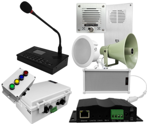 For VoIP integration, SIP speakers register directly as extensions on compatible phone systems, while IP speakers require the AU-711-SIP gateway device. Additional hardware modules include IP-based microphone call stations with zone control capabilities, two-way intercom terminals for entrance points, and IP call boxes for distributed announcement stations.