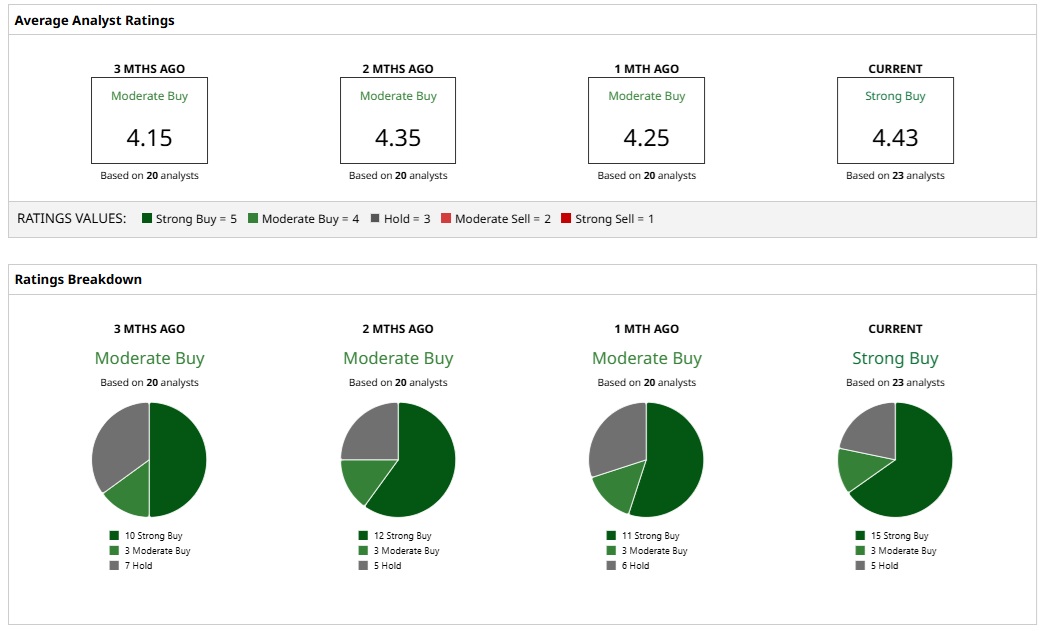 While 15 analysts have assigned a “Strong Buy” rating, three and five analysts have a “Moderate Buy” and “Hold” rating, respectively.
