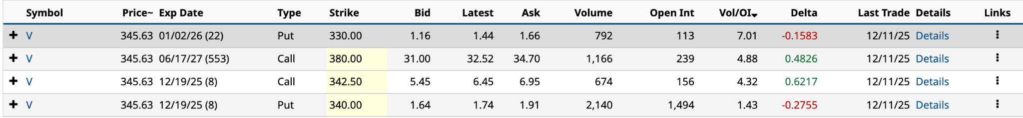 The $342.50 strike price is less ideal today than it was at yesterday’s close. Visa’s share price is up a few dollars, so the call is further ITM, while the put is further OTM.