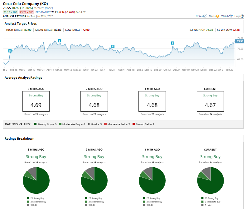 Among the 24 analysts covering KO stock, the consensus is a “Strong Buy.” That’s based on 19 “Strong Buy” ratings, two “Moderate Buys,” and three “Holds.”