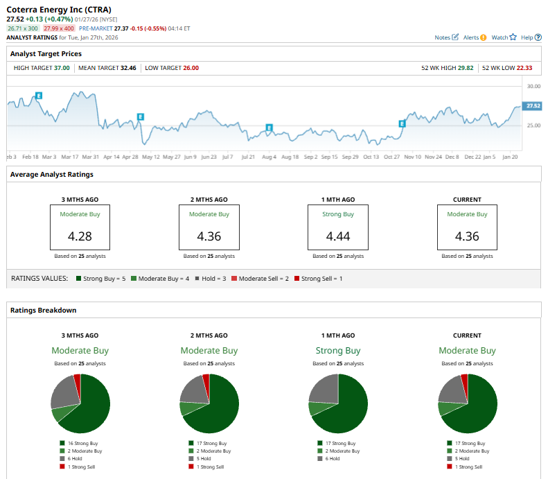 Among the 25 analysts covering CTRA stock, the consensus is a “Moderate Buy.” That’s based on 17 “Strong Buy” ratings, two “Moderate Buys,” five “Holds,” and one “Strong Sell.”