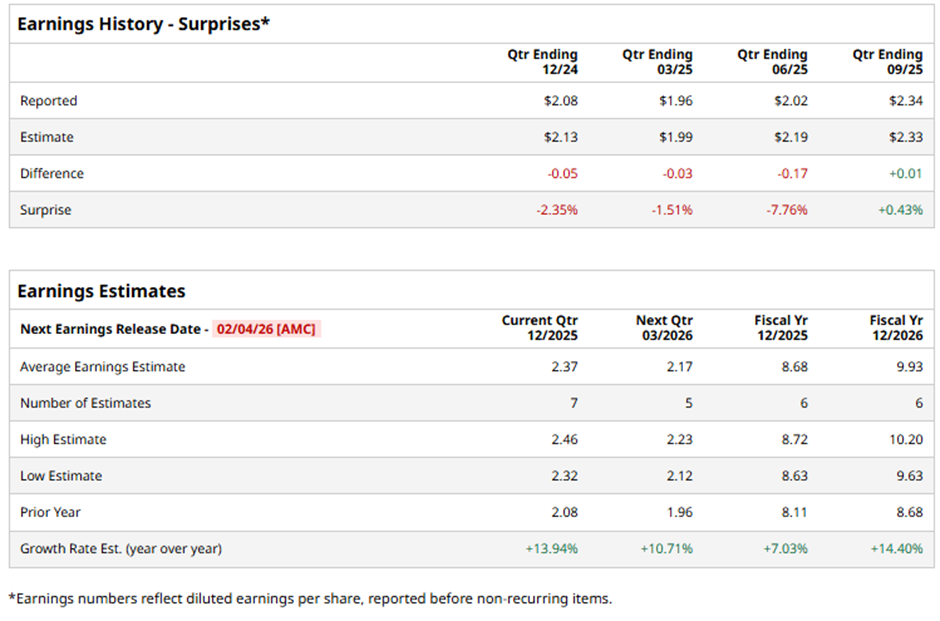 The New York-based company is set to announce its fiscal Q4 2025 results after the market closes on Wednesday, Feb. 4. Ahead of this event, analysts forecast MET to report an adjusted EPS of $2.37, an increase of 13.9% from $2.08 in the year-ago quarter. It has surpassed Wall Street's earnings estimates in one of the last four quarters while missing on three other occasions.