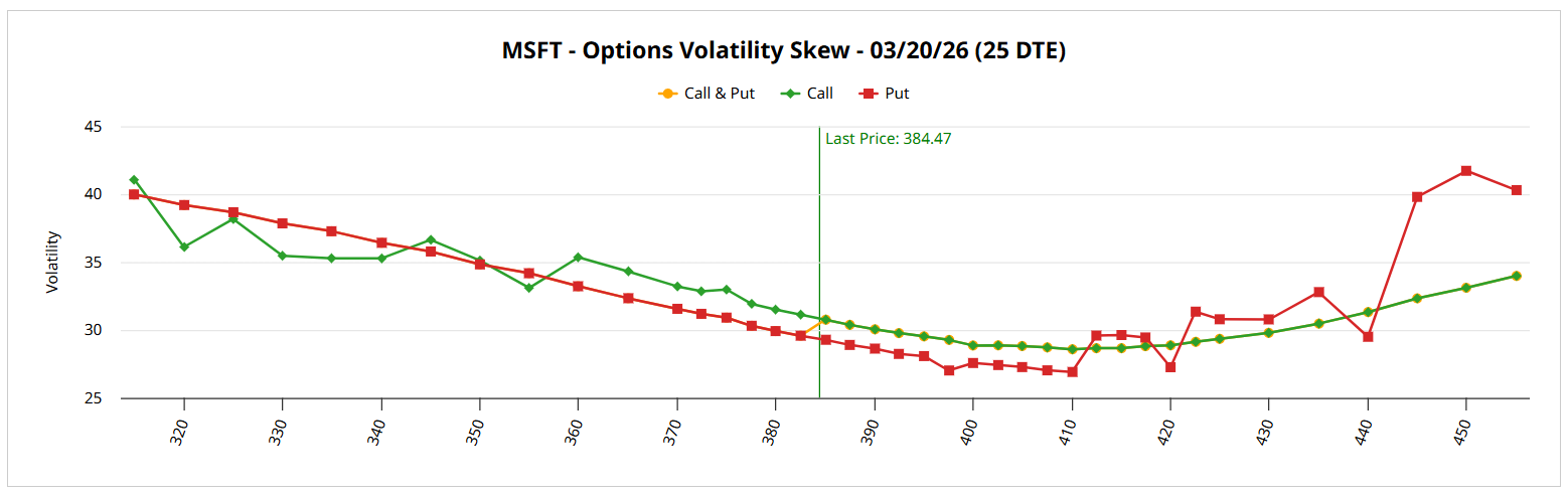 In the case of MSFT’s March 20 expiration date, the skew swings upward to the left, potentially indicating prioritization of downside protection. However, the rise in the skew is controlled, meaning no unusual urgency. On the right side, the skew (for calls) also rises modestly, indicating a positioning for possible upside expression.