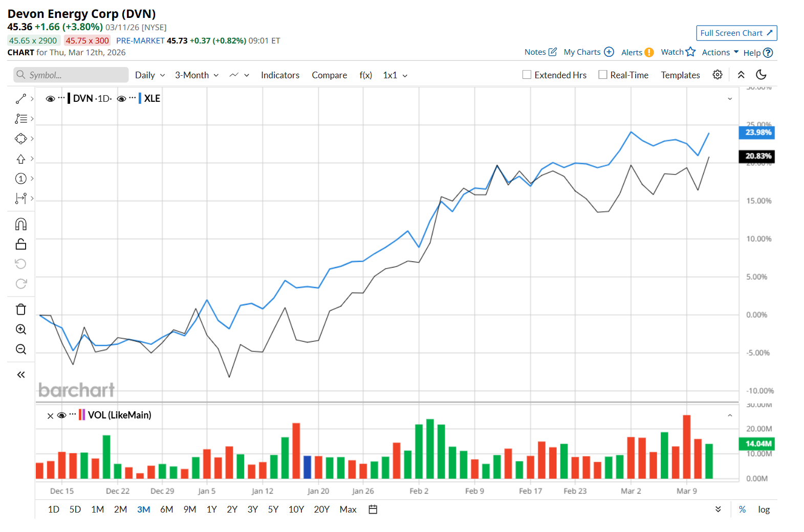 This energy company is currently trading 1.7% below its 52-week high of $46.15, reached on Feb. 19. Shares of DVN have soared 21.8% over the past three months, underperforming the State Street Energy Select Sector SPDR ETF’s (XLE) 26.2% return during the same time frame.