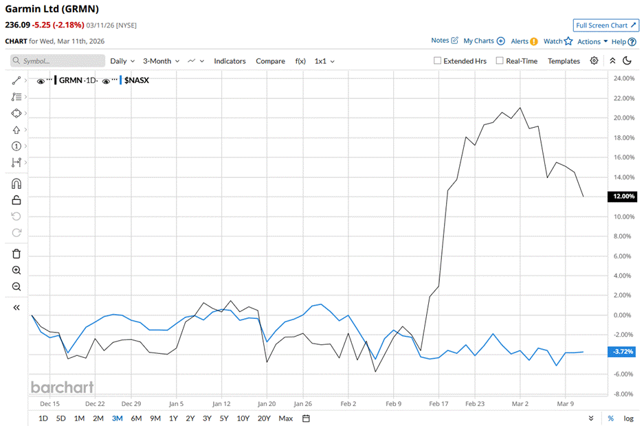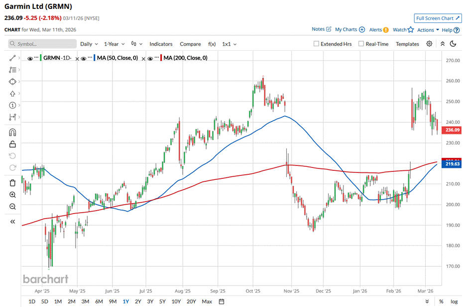 GRMN stock reached its 52-week high of $261.69 on Oct. 09, 2025, and has slipped 9.8% from that peak. The stock has surged 12% over the past three months, outperforming the Nasdaq Composite ($NASX), which declined 3.7% during the same time frame.