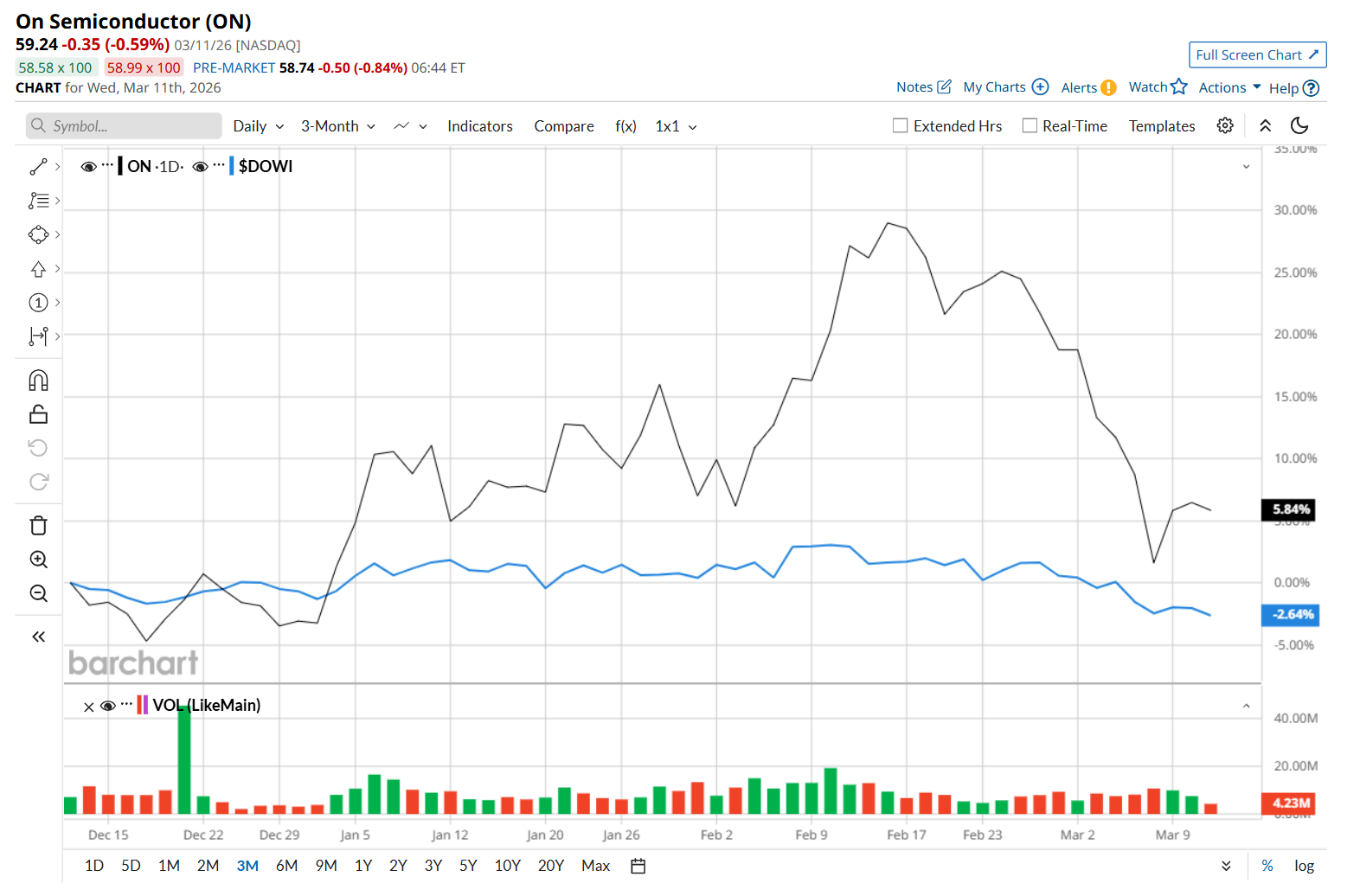 This semiconductor company is currently trading 19.7% below its 52-week high of $73.76, reached on Feb. 18. Shares of ON have gained 5.8% over the past three months, outperforming the Dow Jones Industrial Average’s ($DOWI) 2.6% drop during the same time frame.