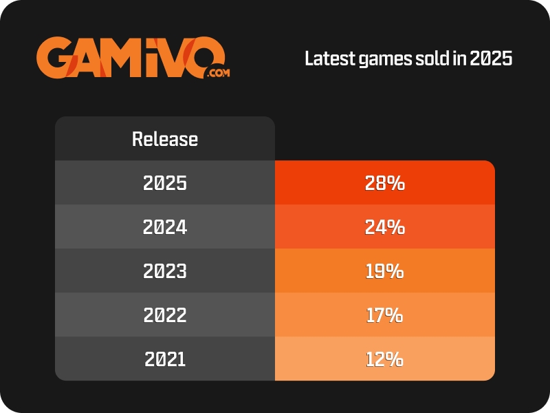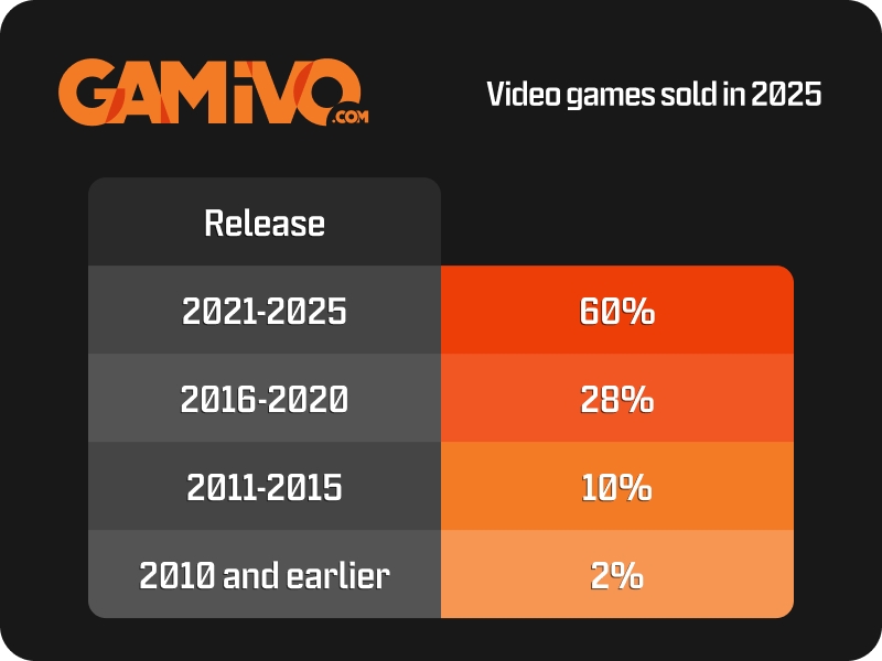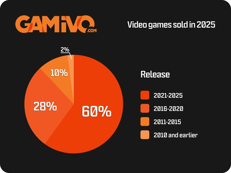 First, GAMIVO experts examined video games sold on the platform in 2025. This analysis disclosed that gamers overwhelmingly favor the latest releases, with 60% of video game purchases this year featuring titles released between 2021 and 2025. This preference becomes even more evident upon deeper analysis of games from this particular period.