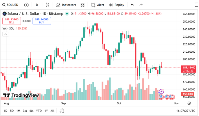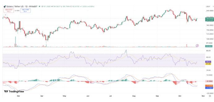 On-chain data indicate increased developer activity and growth in transaction volume, a positive long-term indicator of adoption. The Relative Strength Index (RSI) and MACD both indicate strengthening buyers. Analysts say, if Solana can maintain a clean breakout above the Ichimoku Cloud ($199–$200), it could target the $215–$250 area.