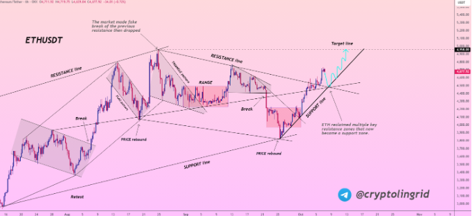 The Ethereum price keeps trending higher after a V-reversal, climbing with tight pullbacks and higher lows. Bulls need the Ethereum price to hold the $4.62k to $4.55k support band to keep momentum intact.