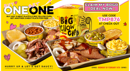 Dallas, TX, Feb. 14, 2025 (GLOBE NEWSWIRE) -- Love is in the air and so is the mouthwatering aroma of slow-smoked barbecue. This Valentine’s Day only, Dickey’s Barbecue Pit is offering the perfect way to celebrate with your sweetheart: Buy One 2 Meat Plate and 2 Big Yellow Cups, Get Another 2 Meat Plate Free when using the code TMP876 at checkout.