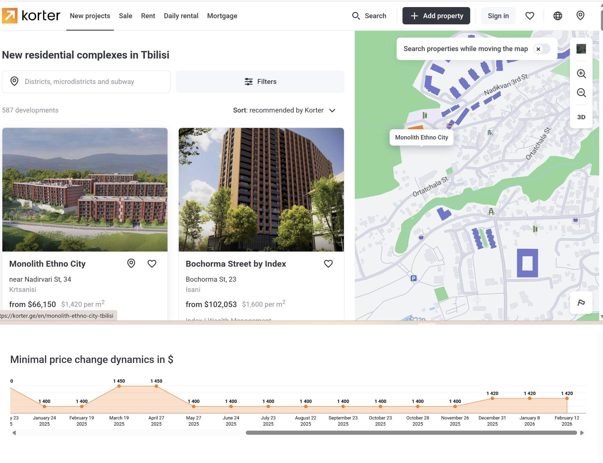 The new features are available to users directly on the Korter.ge platform. The interactive map allows visitors to explore residential projects geographically, while the price trend tracking feature provides visualized historical pricing information for individual developments.
