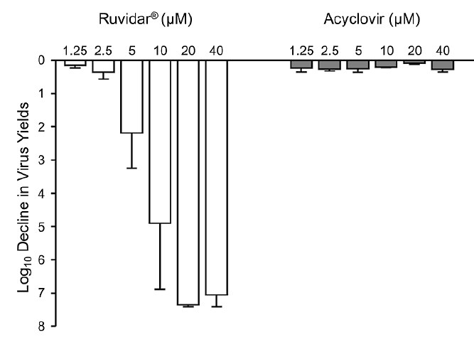 Figure 1: Anti-viral effect of Ruvidar® versus Acyclovir in HSV-1 (24 hours post infection)