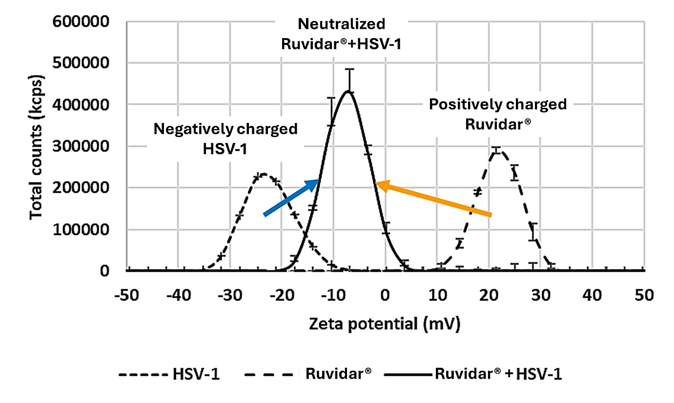 An additional MOA to be investigated was the electrostatic attraction between positively charged Ruvidar® and negatively charged HSV-1. This interaction was easily validated by measuring the zeta potential (reflects surface charge) in aqueous solutions of Ruvidar®, HSV-1 and in a combination of both. A reversal or significant change in the zeta potential of the combination would confirm the electrostatic binding of Ruvidar® to HSV-1.